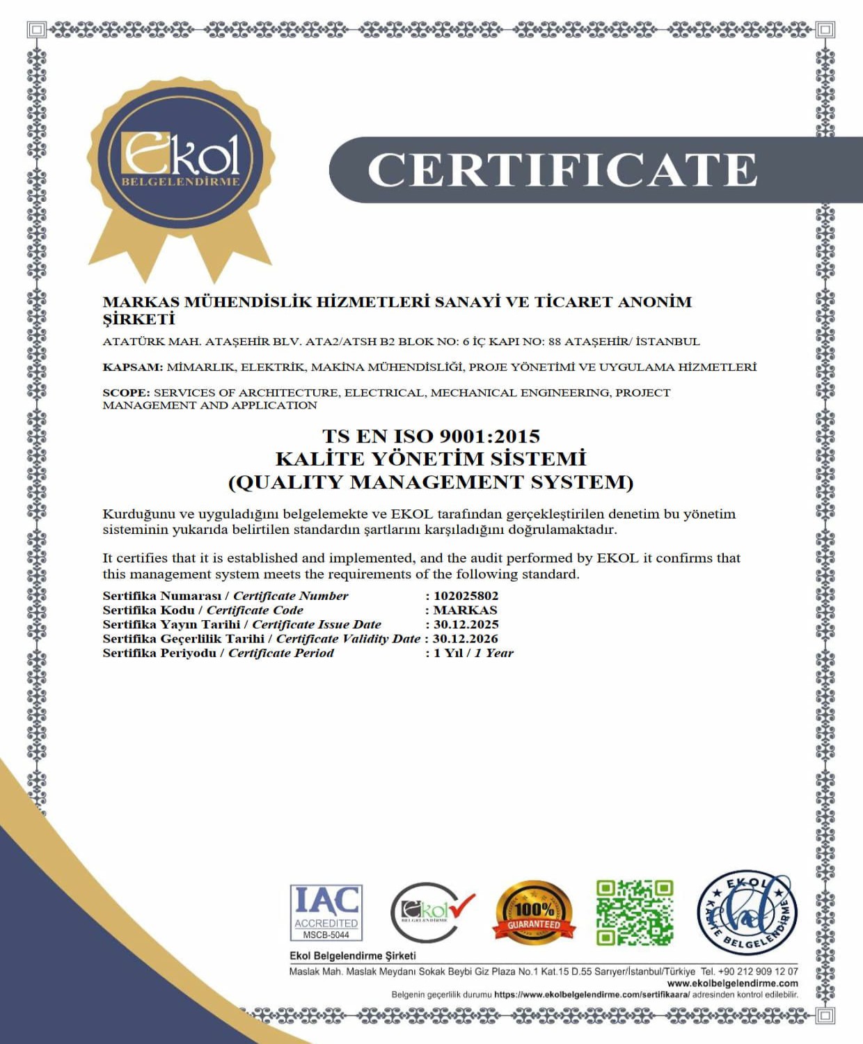 Projelerimizi ulusal ve uluslararası standartlara uygun, yüksek kaliteli, uygun maliyetli ve iş programına uygun olarak tamamlamak. Tüm bunları gerçekleştirirken MARKAS ekibinin kariyer gelişimine katkı sağlamak.